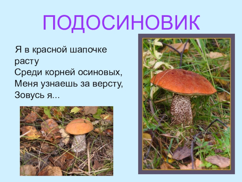 ПОДОСИНОВИКЯ в красной шапочке расту Среди корней осиновых, Меня узнаешь за версту, Зовусь я...