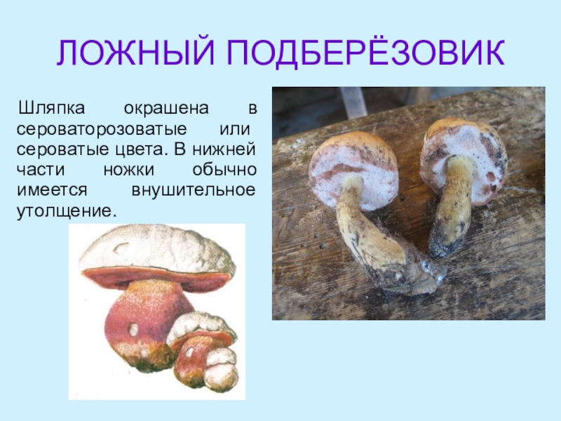 ЛОЖНЫЙ ПОДБЕРЁЗОВИКШляпка окрашена в серовато­розоватые или сероватые цвета. В нижней части ножки обычно имеется внушительное утолщение.