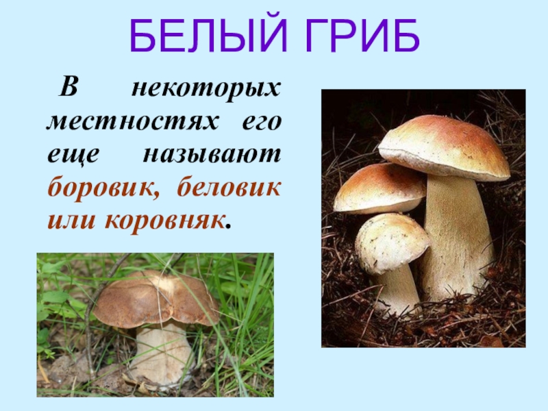 БЕЛЫЙ ГРИБВ некоторых местностях его еще называют боровик, беловик или коровняк.