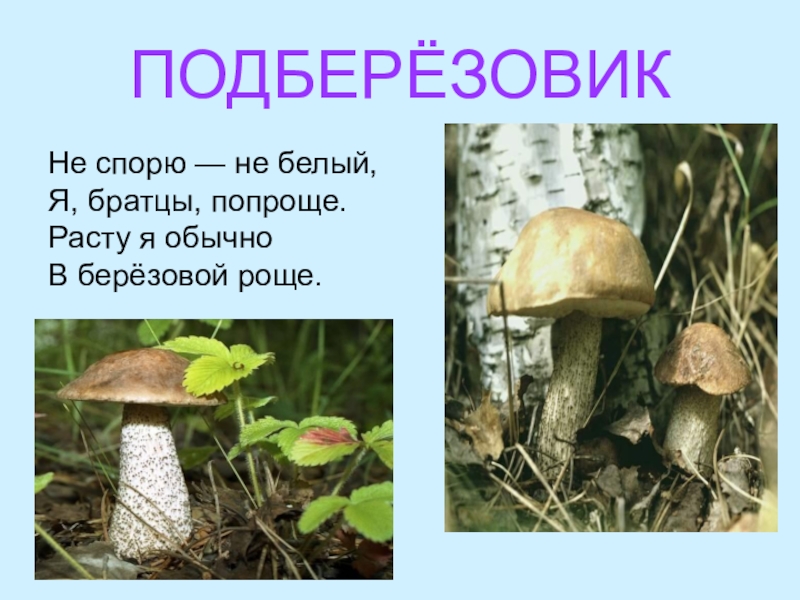 ПОДБЕРЁЗОВИКНе спорю — не белый, Я, братцы, попроще. Расту я обычно В берёзовой роще.