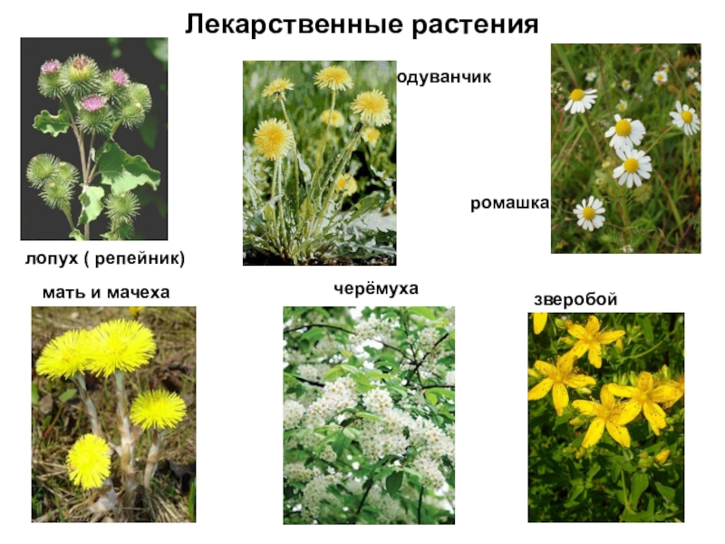 Лекарственные растениялопух ( репейник)мать и мачехаодуванчикромашкачерёмухазверобой