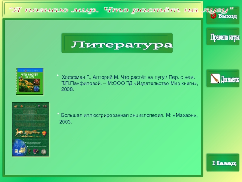 * Хоффман Г., Алторяй М. Что растёт на лугу / Пер. с нем. Т.П.Панфиловой. – М:ООО ТД «Издательство Мир книги», 2008.