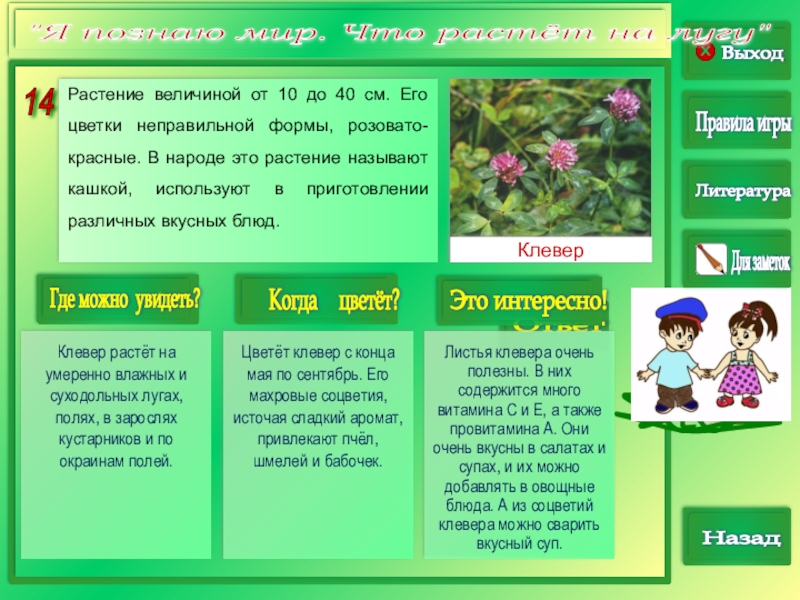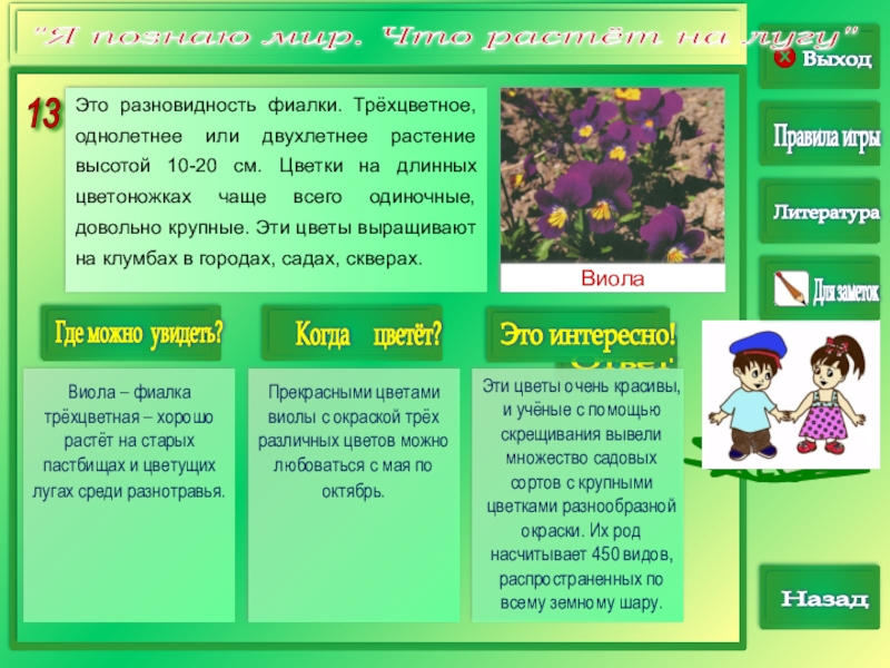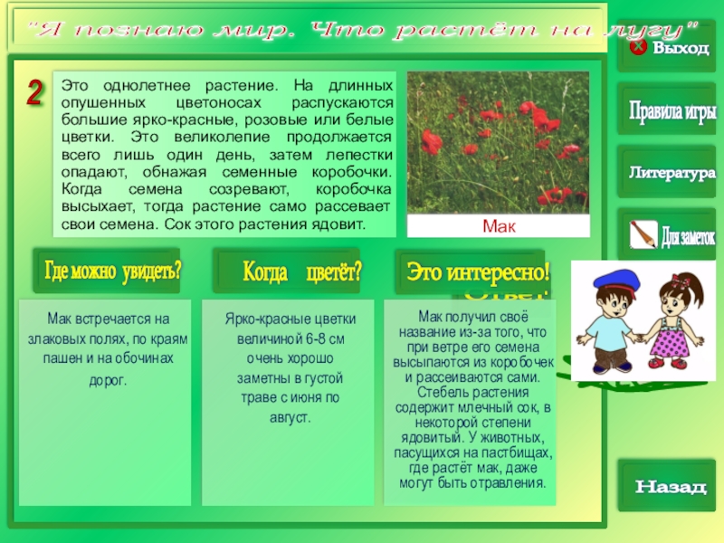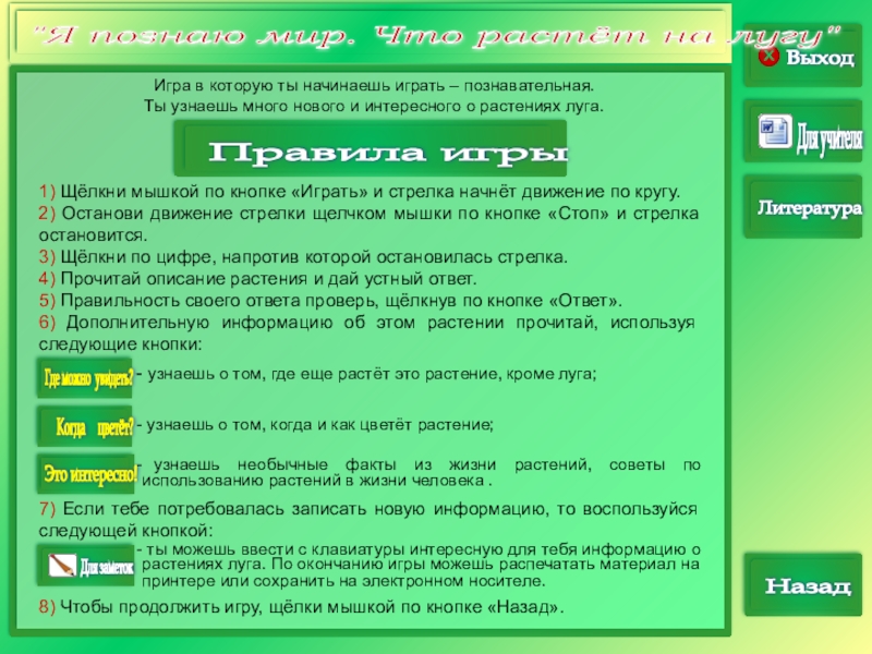 ты можешь ввести с клавиатуры интересную для тебя информацию о растениях луга. По окончанию игры можешь распечатать материал на принтере или сохранить на электронном носителе.