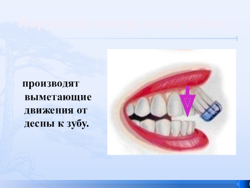 производят выметающие движения от десны к зубу. Наружные поверхности зубов: