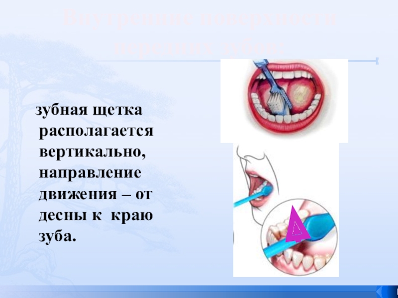 зубная щетка располагается вертикально, направление движения – от десны к краю зуба.Внутренние поверхности передних зубов: