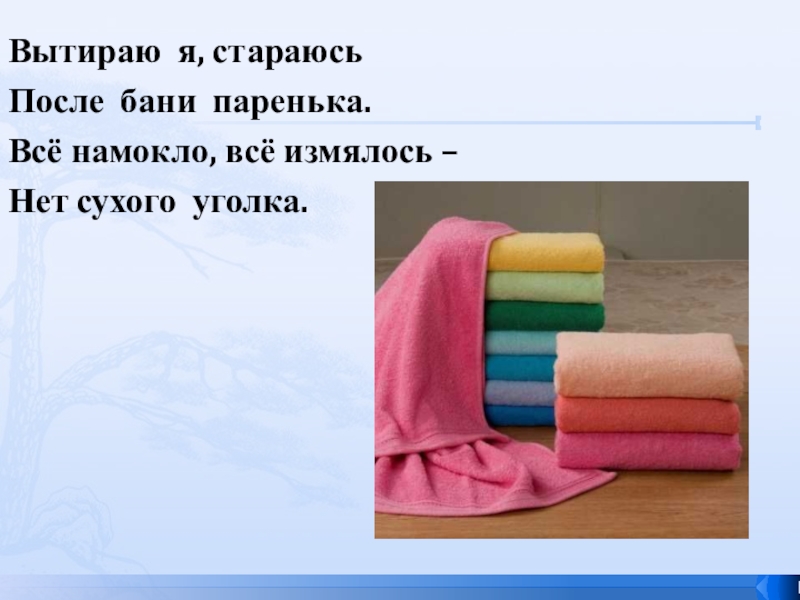 Вытираю я, стараюсьПосле бани паренька.Всё намокло, всё измялось – Нет сухого уголка.