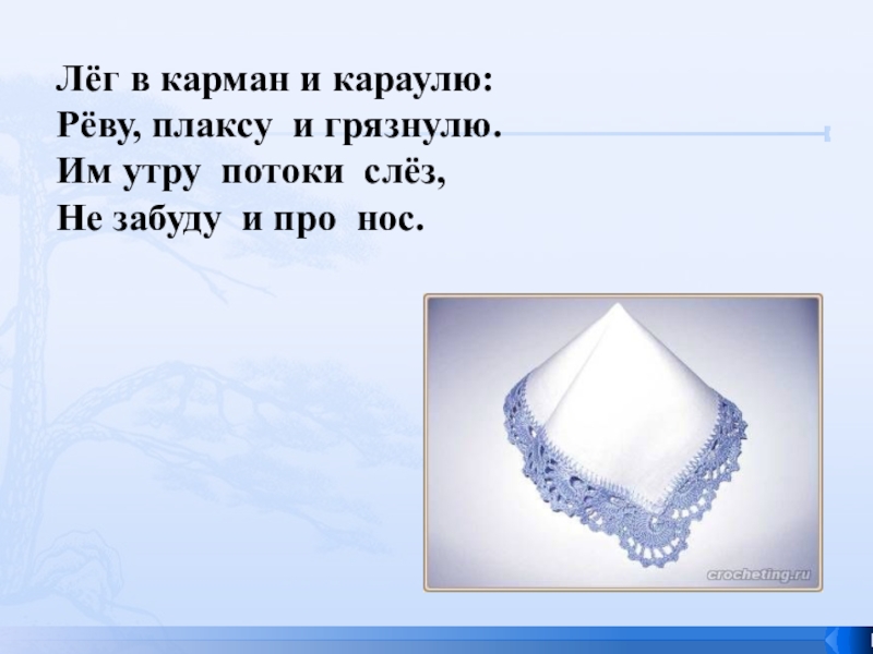 Лёг в карман и караулю:Рёву, плаксу и грязнулю.Им утру потоки слёз,Не забуду и про нос.