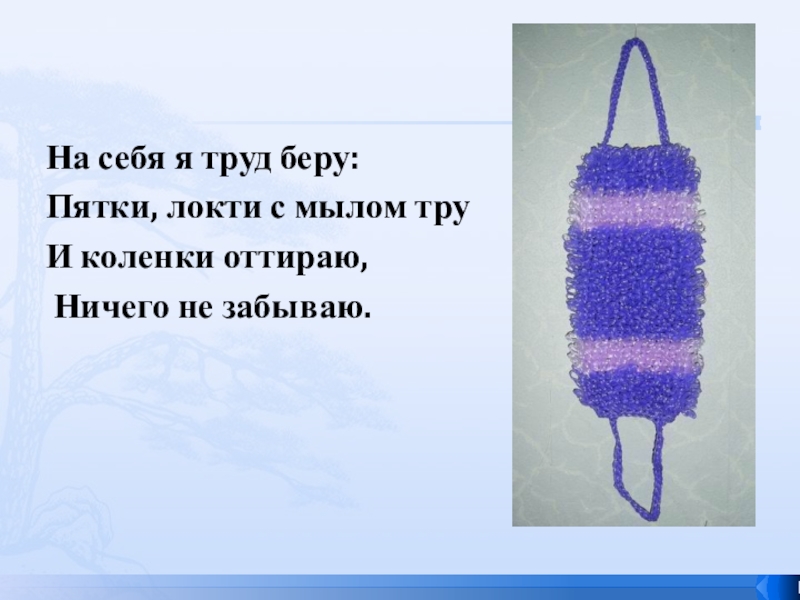 На себя я труд беру:Пятки, локти с мылом труИ коленки оттираю, Ничего не забываю.