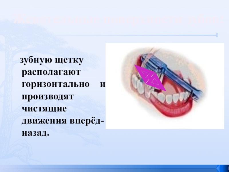 зубную щетку располагают горизонтально  и производят чистящие движения вперёд-назад. Жевательные поверхности зубов: