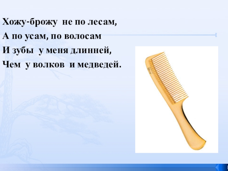 Хожу-брожу не по лесам,А по усам, по волосамИ зубы у меня длинней,Чем у волков и медведей.