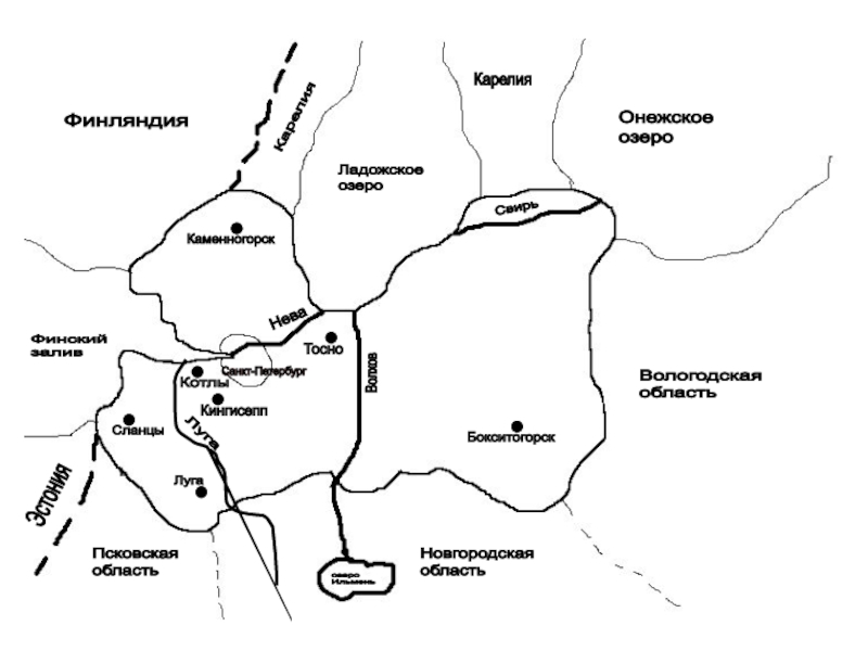 Финский  заливФинляндияКарелияКарелияПсковская  областьОнежское  озероВологодская  областьНовгородская  областьЛадожское  озероЭстонияНеваВолховЛугаСвирьозеро  ИльменьСанкт-ПетербургКотлы