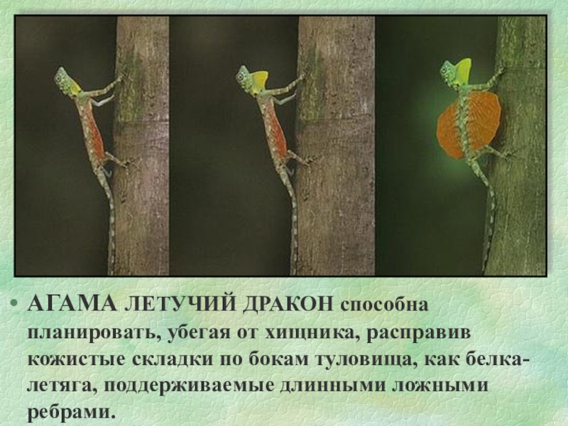 Слайд 20АГАМА ЛЕТУЧИЙ ДРАКОН способна планировать, убегая от хищника, расправив кожистые складки