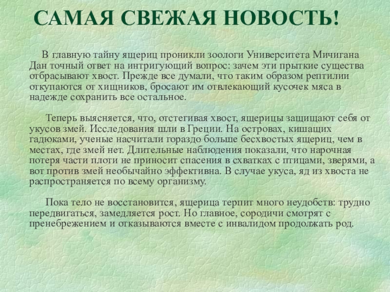 Теперь выясняется, что, отстeгивая хвост, ящерицы защищают себя от укусов змей. Исследования шли в Греции. На островах, кишащих гадюками, ученые насчитали гораздо больше бесхвостых ящериц, чем в местах, где змей нет. Длительные наблюдения показали, что нарочная потеря части плоти не приносит спасения в схватках с птицами, зверями, а вот против змей необычайно эффективна. В случае укуса, яд из хвоста не распространяется по всему организму.