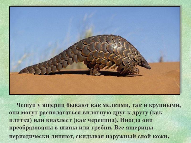 так и крупными, они могут располагаться вплотную друг к другу (как плитка) или внахлест (как черепица). Иногда они преобразованы в шипы или гребни. Все ящерицы периодически линяют, скидывая наружный слой кожи.