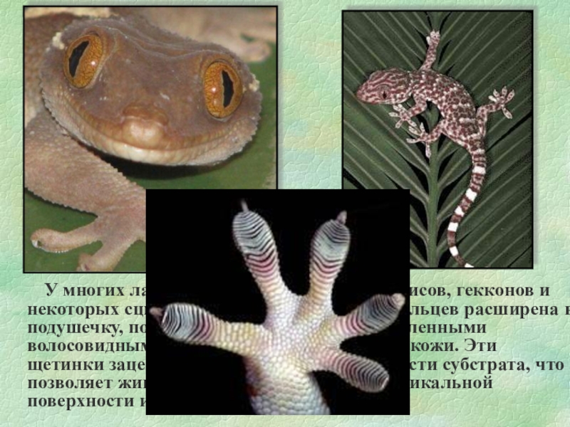 Слайд 16 У многих лазающих форм, например анолисов, гекконов