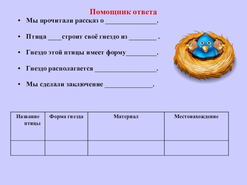 Помощник ответаМы прочитали рассказ о _______________.Птица ____строит своё гнездо из ________ .Гнездо этой птицы имеет форму_________.Гнездо располагается