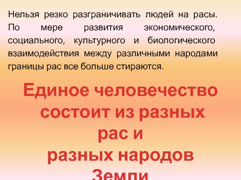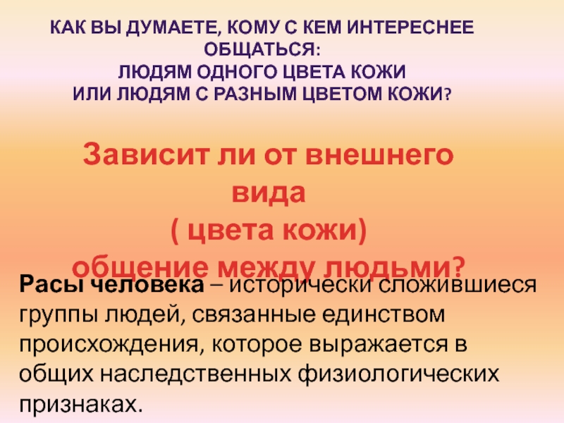 Расы человека – исторически сложившиеся группы людей, связанные единством происхождения, которое выражается в общих наследственных физиологических признаках.