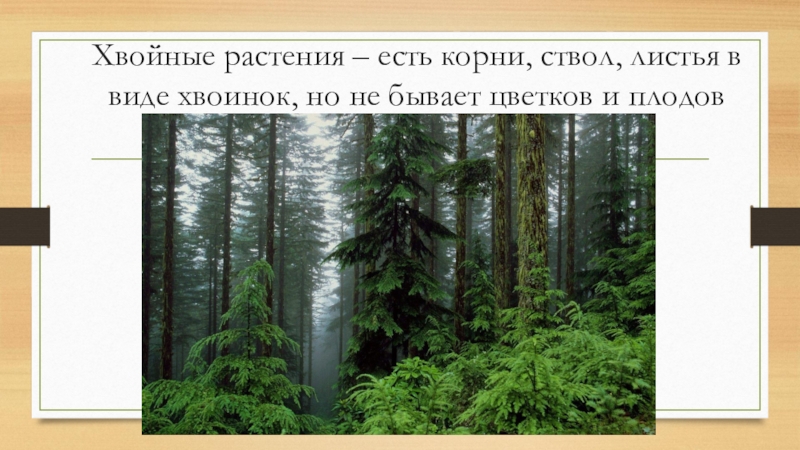 Слайд 11Хвойные растения – есть корни, ствол, листья в виде хвоинок, но