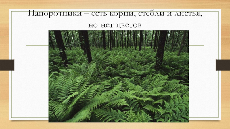 Слайд 10Папоротники – есть корни, стебли и листья, но нет цветов