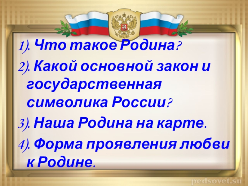 1). Что такое Родина?2). Какой основной закон и государственная символика России?3). Наша Родина на карте.4). Форма проявления