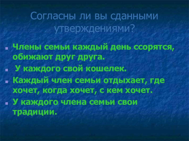 Согласны ли вы сданными утверждениями?Члены семьи каждый день ссорятся, обижают друг друга. У каждого свой кошелек. Каждый