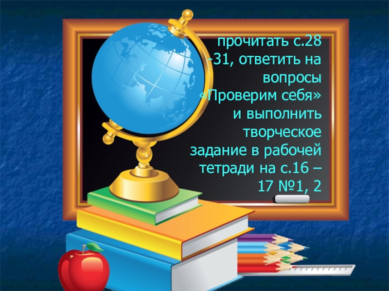 Слайд 17прочитать с.28 -31, ответить на вопросы «Проверим себя» и выполнить творческое