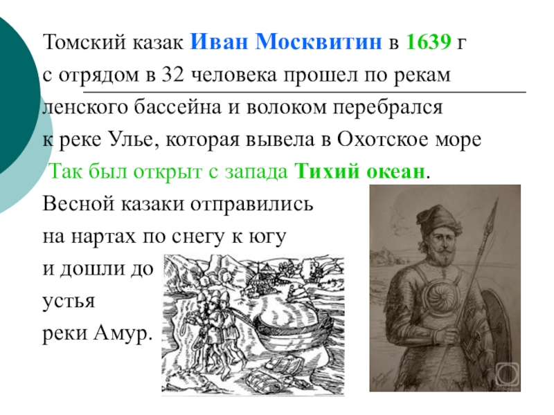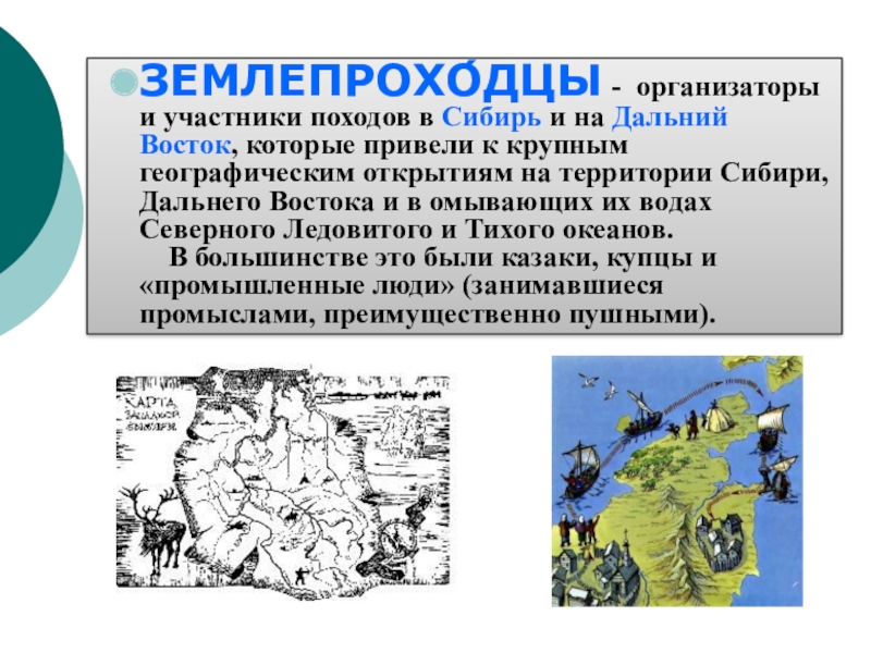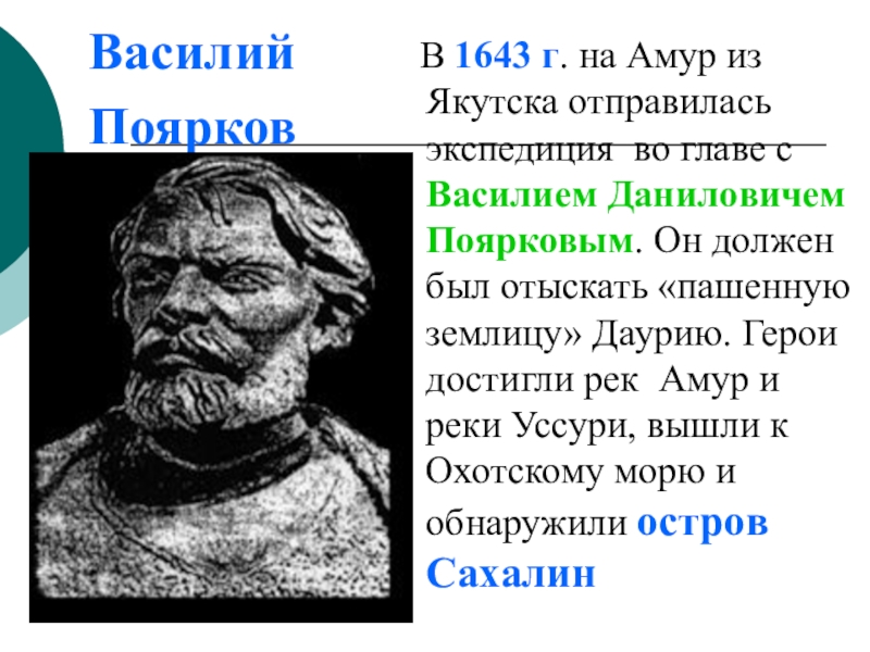Василий Поярков и Ерофей Хабаров в 1649-1653 годах со своими отрядами вышли на Амур. Землепроходцы обошли все северное побережье Азии, открыв полуострова Ямал, Таймыр, Чукотку.