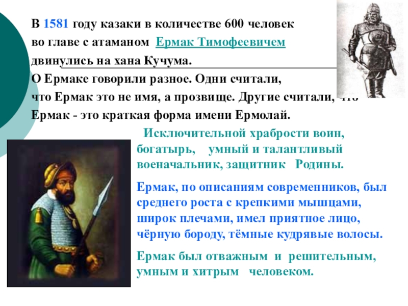 Ермак был отважным и решительным, умным и хитрым человеком.