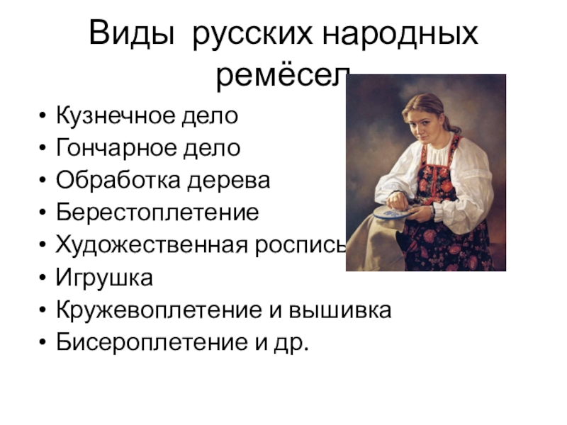 Виды русских народных ремёселКузнечное делоГончарное делоОбработка дереваБерестоплетениеХудожественная росписьИгрушкаКружевоплетение и вышивкаБисероплетение и др.