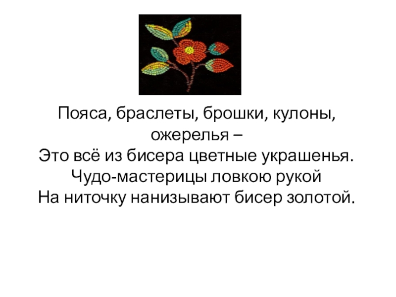 Пояса, браслеты, брошки, кулоны, ожерелья – Это всё из бисера цветные украшенья. Чудо-мастерицы ловкою рукой На ниточку