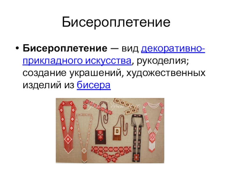 Бисероплетение — вид декоративно-прикладного искусства, рукоделия; создание украшений, художественных изделий из бисера
