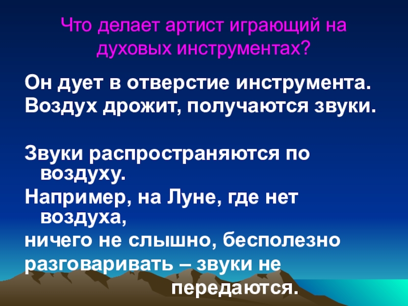 Слайд 16Что делает артист играющий на духовых инструментах?