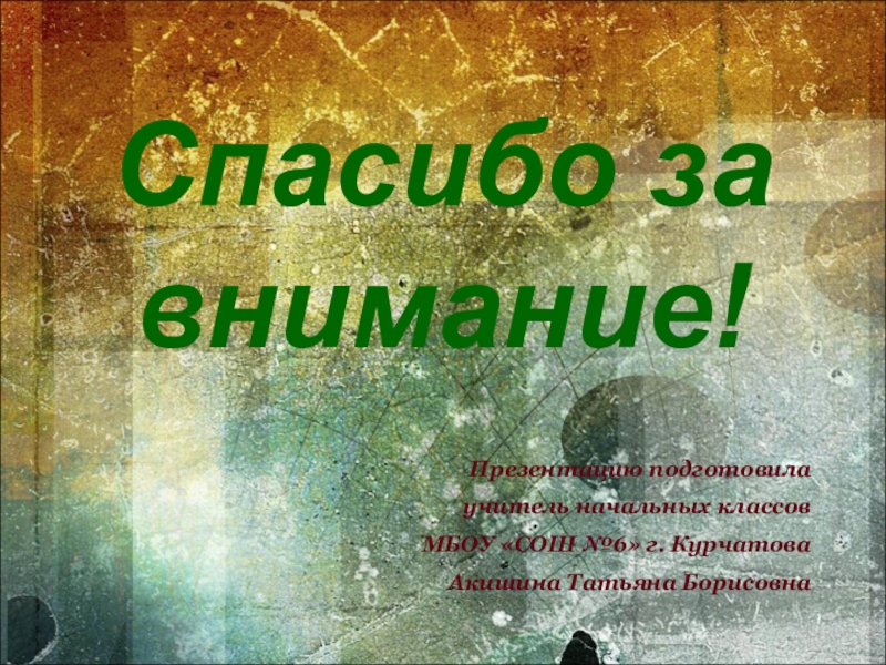 Презентацию подготовилаучитель начальных классовМБОУ «СОШ №6» г. КурчатоваАкишина Татьяна БорисовнаСпасибо за внимание!
