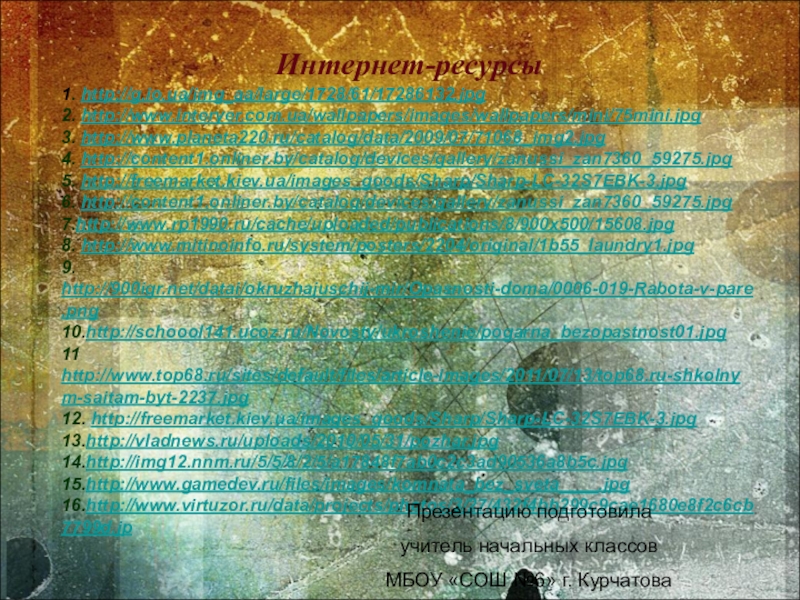 Интернет-ресурсы1. http://g.io.ua/img_aa/large/1728/61/17286132.jpg2. http://www.interyer.com.ua/wallpapers/images/wallpapers/mini/75mini.jpg3. http://www.planeta220.ru/catalog/data/2009/07/71068_img2.jpg4. http://content1.onliner.by/catalog/devices/gallery/zanussi_zan7360_59275.jpg5. http://freemarket.kiev.ua/images_goods/Sharp/Sharp-LC-32S7EBK-3.jpg6. http://content1.onliner.by/catalog/devices/gallery/zanussi_zan7360_59275.jpg7.http://www.rp1990.ru/cache/uploaded/publications/8/900x500/15608.jpg8. http://www.mitinoinfo.ru/system/posters/2204/original/1b55_laundry1.jpg9. http://900igr.net/datai/okruzhajuschij-mir/Opasnosti-doma/0006-019-Rabota-v-pare.png10.http://schoool141.ucoz.ru/Novosty/ukroshenie/pogarna_bezopastnost01.jpg11 http://www.top68.ru/sites/default/files/article-images/2011/07/13/top68.ru-shkolnym-saitam-byt-2237.jpg12. http://freemarket.kiev.ua/images_goods/Sharp/Sharp-LC-32S7EBK-3.jpg13.http://vladnews.ru/uploads/2010/05/31/pozhar.jpg14.http://img12.nnm.ru/5/5/8/2/5/a17848f7ab0c2c3ad90536a8b5c.jpg15.http://www.gamedev.ru/files/images/komnata_bez_sveta____.jpg16.http://www.virtuzor.ru/data/projects/photos/3/27/432f4bb299c9cae1680e8f2c6cb7799d.jpПрезентацию подготовилаучитель начальных классовМБОУ «СОШ №6» г.