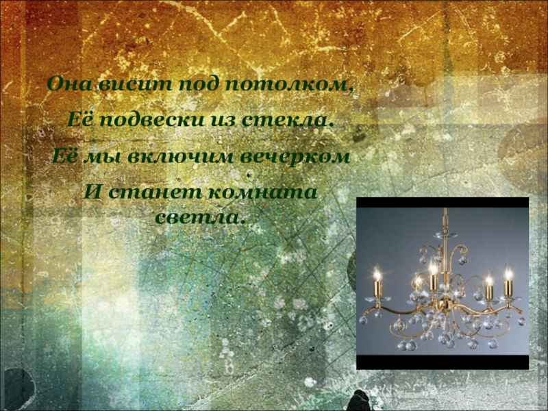 Она висит под потолком,Её подвески из стекла.Её мы включим вечеркомИ станет комната светла.