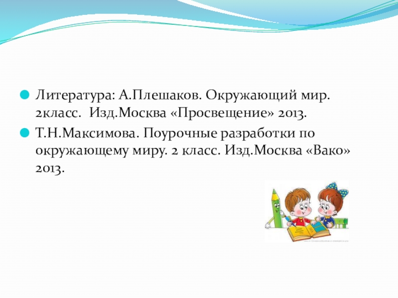 Литература: А.Плешаков. Окружающий мир. 2класс. Изд.Москва «Просвещение» 2013.Т.Н.Максимова. Поурочные разработки по окружающему миру. 2 класс. Изд.Москва «Вако»2013.