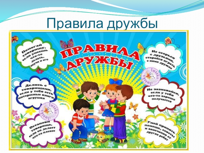 Правила дружбыУступать.Не бояться просить прощения, если обидел друга.Не грубить, не злиться.Не жадничать.Помогать другу.Быть честным с другом.
