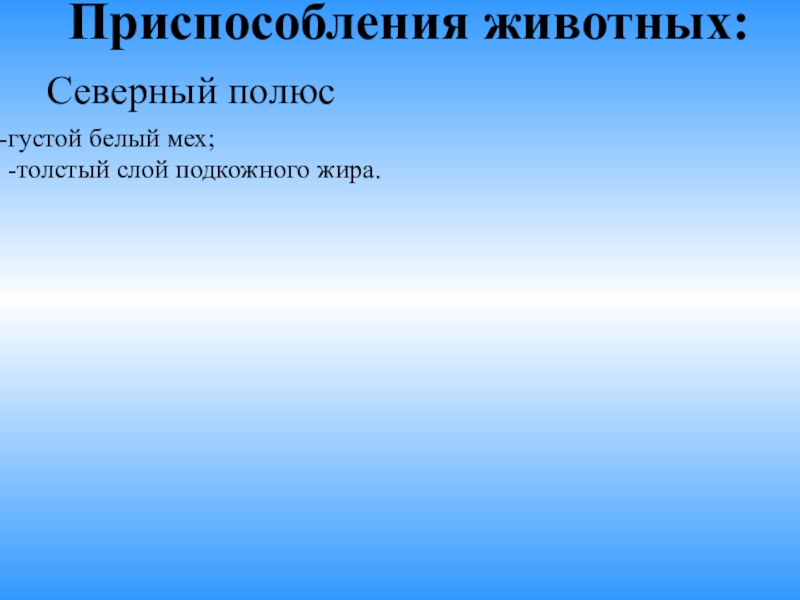 Приспособления животных:Северный полюсгустой белый мех;-толстый слой подкожного жира.