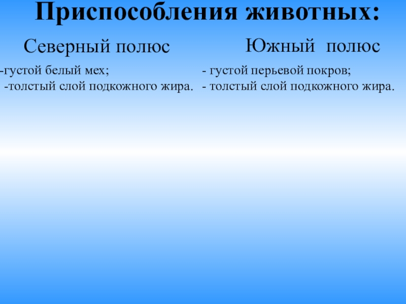 Приспособления животных:Северный полюсЮжный полюсгустой белый мех;-толстый слой подкожного жира. густой перьевой покров; толстый слой подкожного жира.