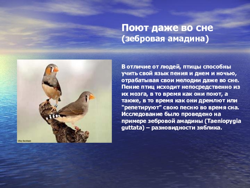 свой язык пения и днем и ночью, отрабатывая свои мелодии даже во сне. Пение птиц исходит непосредственно из их мозга, в то время как они поют, а также, в то время как они дремлют или "репетируют" свою песню во время сна. Исследование было проведено на примере зебровой амадины (Taeniopygia guttata) – разновидности зяблика.