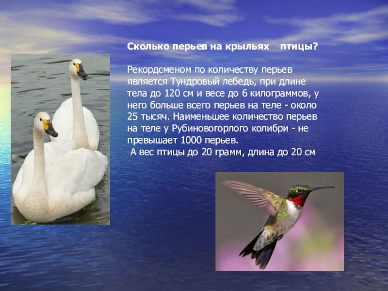 лебедь, при длине тела до 120 см и весе до 6 килограммов, у него больше всего перьев на теле - около 25 тысяч. Наименьшее количество перьев на теле у Рубиновогорлого колибри - не превышает 1000 перьев.