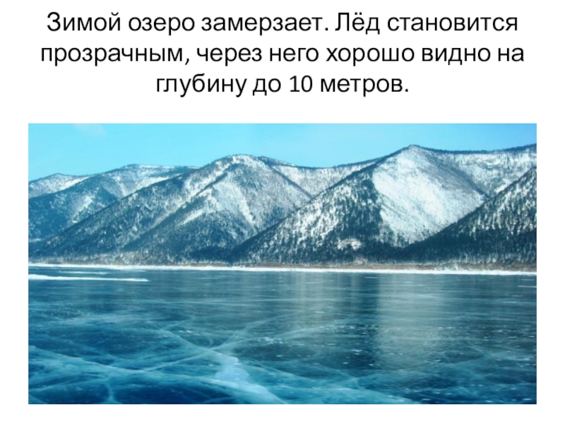 Слайд 5Зимой озеро замерзает. Лёд становится прозрачным, через него хорошо видно на