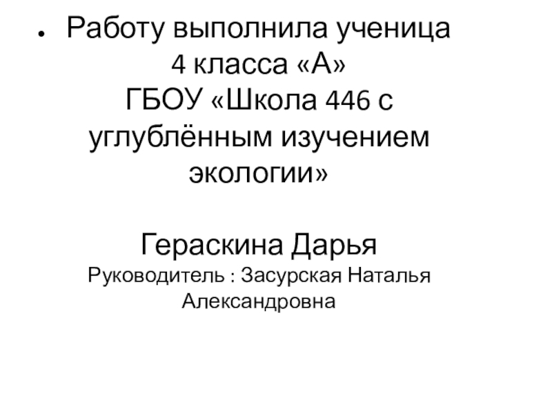 Работу выполнила ученица 4 класса «А» ГБОУ «Школа 446 с углублённым изучением экологии» Гераскина Дарья Руководитель : Засурская Наталья Александровна