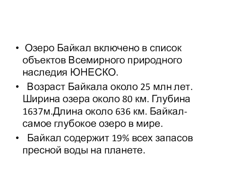 Озеро Байкал включено в список объектов Всемирного природного наследия ЮНЕСКО. Возраст Байкала около 25 млн