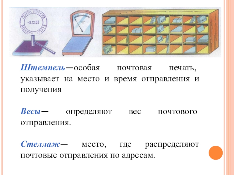 Штемпель—особая почтовая печать, указывает на место и время отправления и полученияВесы— определяют вес почтового отправления.Стеллаж— место, где