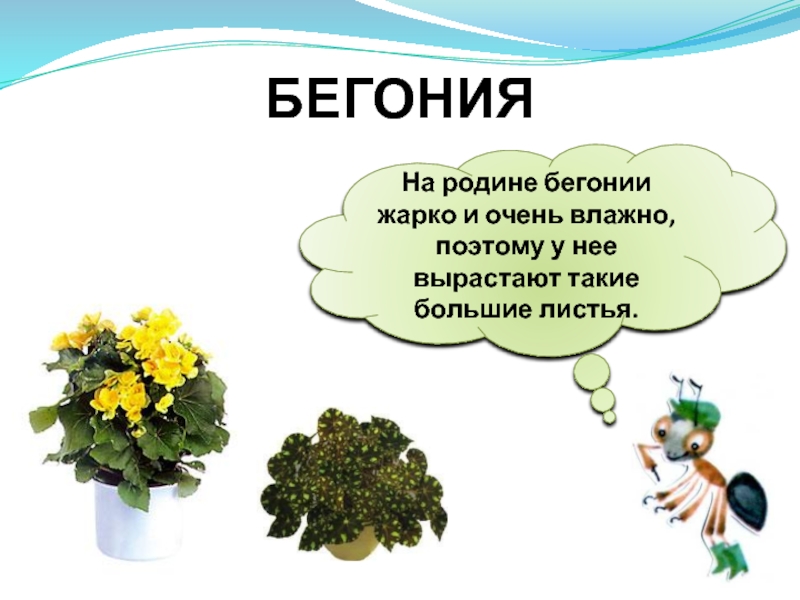 Слайд 6На родине бегонии жарко и очень влажно, поэтому у нее вырастают такие большие листья.