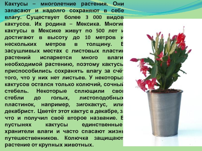 влагу. Существует более 3 000 видов кактусов. Их родина – Мексика. Многие кактусы в Мексике живут по 500 лет и достигают в высоту до 10 метров и нескольких метров в толщину. В засушливых местах с листовых пластин растений испаряется много влаги, необходимой растению, поэтому кактусы приспособились сохранять влагу за счёт того, что у них нет листьев. У некоторых кактусов остался только колючий, сочный стебель. Некоторые сплющили свои стебли до голых, листоподобных пластинок, например, зигокактус, или декабрист. Цветёт этот кактус в декабре, за что и получил своё второе название. В пустынях кактусы единственные хранители влаги и часто спасают жизнь путешественников. Колючка защищают растение от крупных животных.