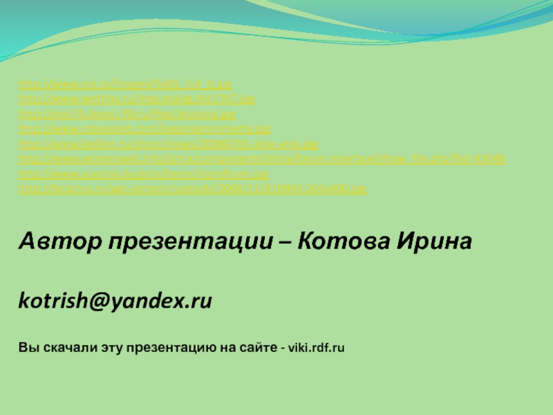 http://www.ivd.ru/images/5685_i14_b.jpghttp://www.wetrina.ru/imgcatalog/pic1767.jpghttp://test74.devel.r70.ru/files/dracena.jpghttp://www.robsviolet.com/begoniaminimerry.jpghttp://www.kedem.ru/photo/news/20080703-aloe-vera.jpghttp://www.womenweb.info/bitrix/components/bitrix/forum.interface/show_file.php?fid=43048http://www.yuviona.by/pics/items/hlorofitum.jpghttp://lecactus.ru/wp-content/uploads/2008/11/819004-266x400.jpgАвтор презентации – Котова Ирина  kotrish@yandex.ru   Вы скачали эту презентацию на сайте - viki.rdf.ru