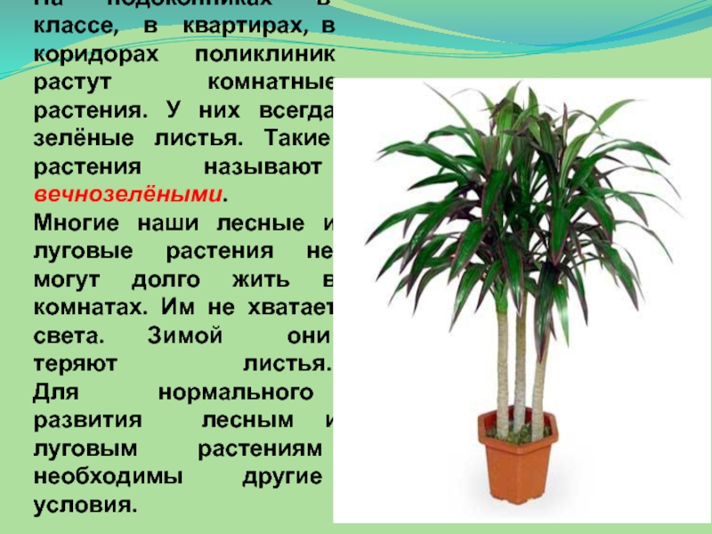 комнатные растения. У них всегда зелёные листья. Такие растения называют вечнозелёными. Многие наши лесные и луговые растения не могут долго жить в комнатах. Им не хватает света. Зимой они теряют листья. Для нормального развития лесным и луговым растениям необходимы другие условия.