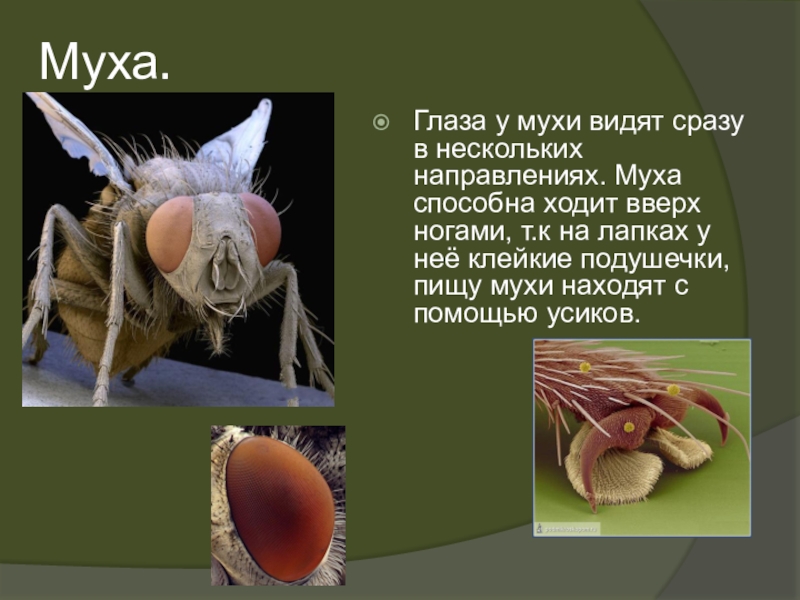 Глаза у мухи видят сразу в нескольких направлениях. Муха способна ходит
